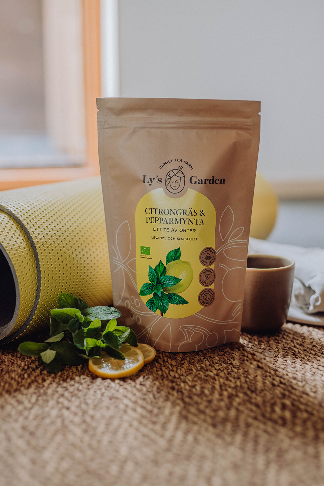 Ingredienser: ekologiskt citrongräs (75%), ekologisk pepparmynta (25%).